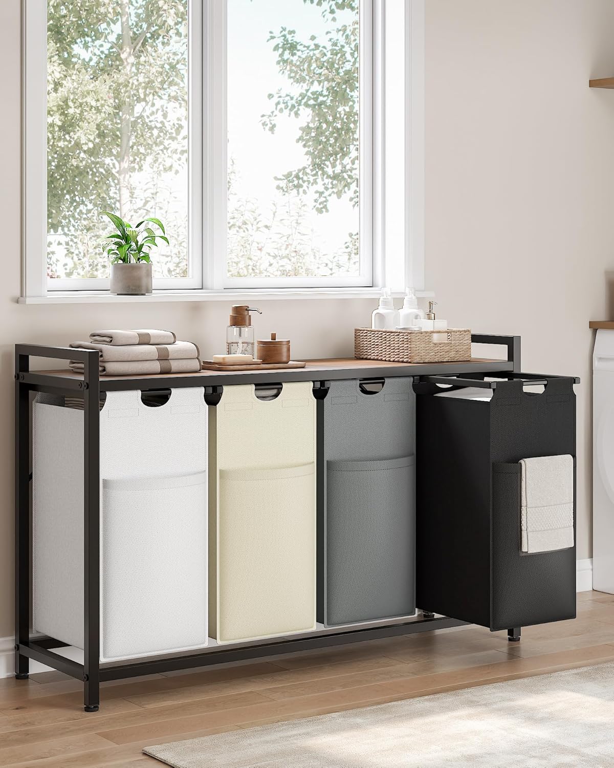 - Pull-out & Removable Design: 4 collapsible laundry sections is designed for easy pull-out of the clothes hamper, then you can remove the laundry bags to the laundry room. Feature a bottom board to offer extra support -No Sag When Laundry Bags Full.