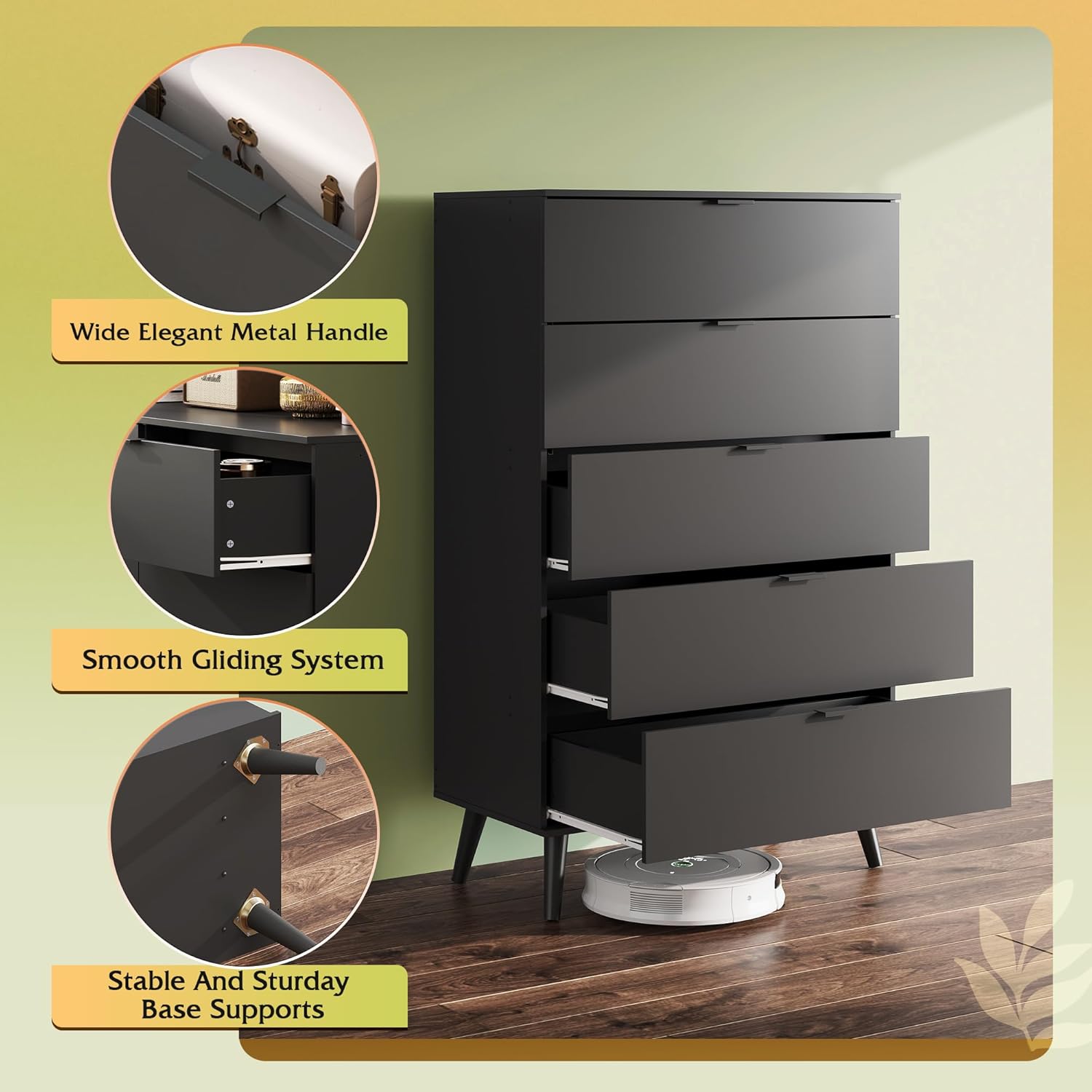 WLIVE 5 Drawer Dresser for Bedroom, Tall Wood Dresser, Black Dressers Storage Organizer with Sturdy Metal Handle, Chest of Drawers for Living Room, Hallway, Closet