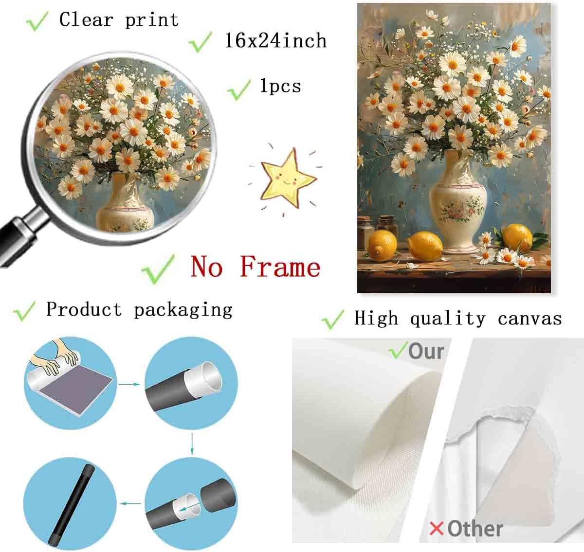 - 1.Canvas wall art specifications:Size:16X24inch,frameless,high-definition canvas wall art prints,printing pictures on canvas,using high-quality environmentally friendly ink,not easy to fade. The colors are beautiful and shiny,high-definition Giclee modern canvas print artwork.