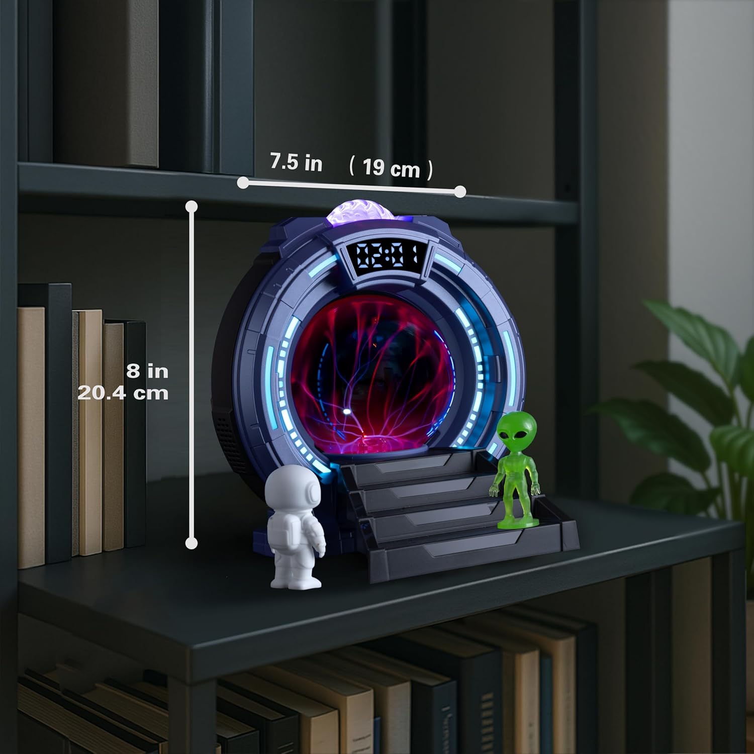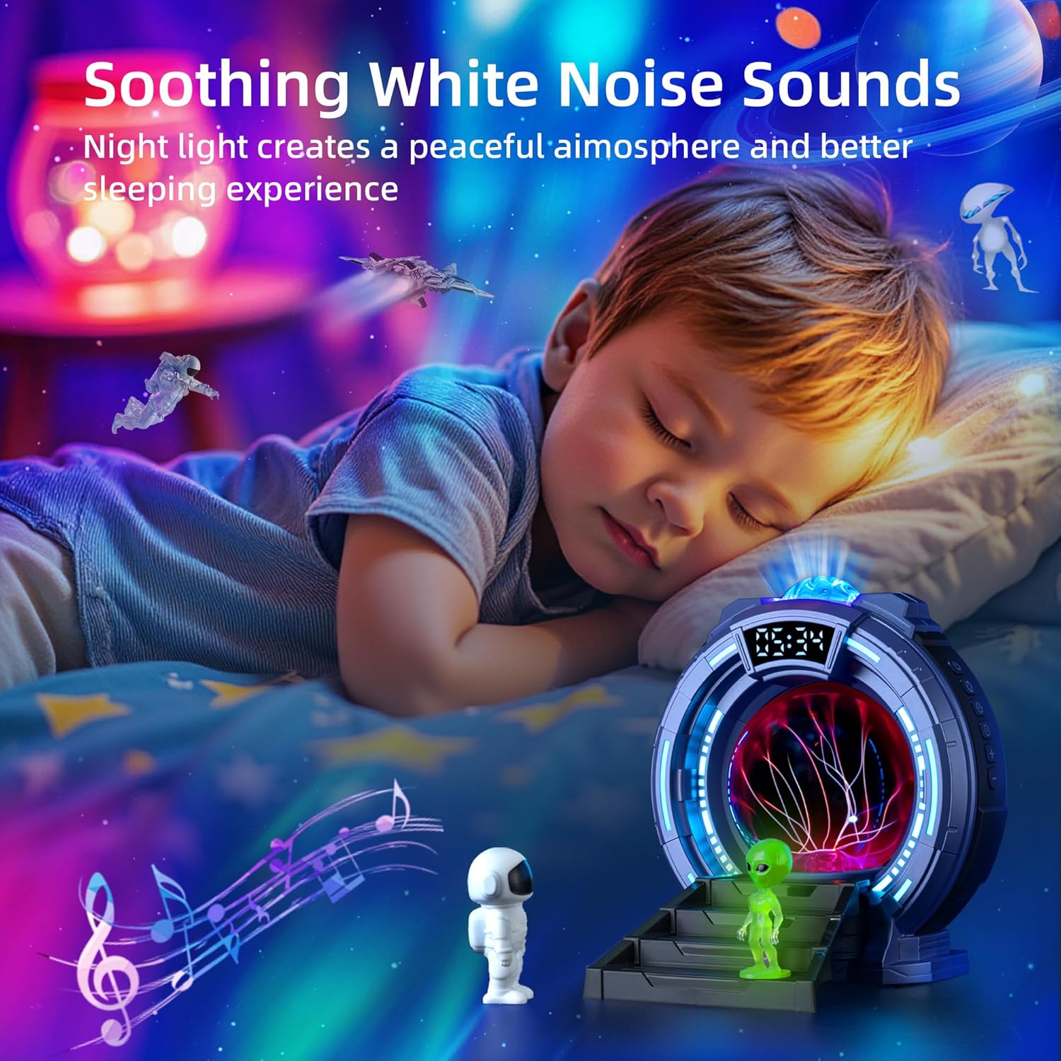 - 6 IN 1 STAR PROJECTION NIGHT LIGHT: ZTFLOS Stargate Projector combines: ion sphere, clock, projector, night light, white noise machine and music player to create an extraordinary audio-visual and auditory experience. With a variety of vibrant colors, it projects a bright starry sky and a starry lightning bolt across the sky scene from the ion sphere, bringing the vastness of the starry sky indoors and allowing you and your child to enjoy a serene time-traveling sensation in your children's room or bedroom. Experience the unparalleled joy of space in a cozy, creative or festive home.You will need to provide your own compliant 5V 2A adapter.