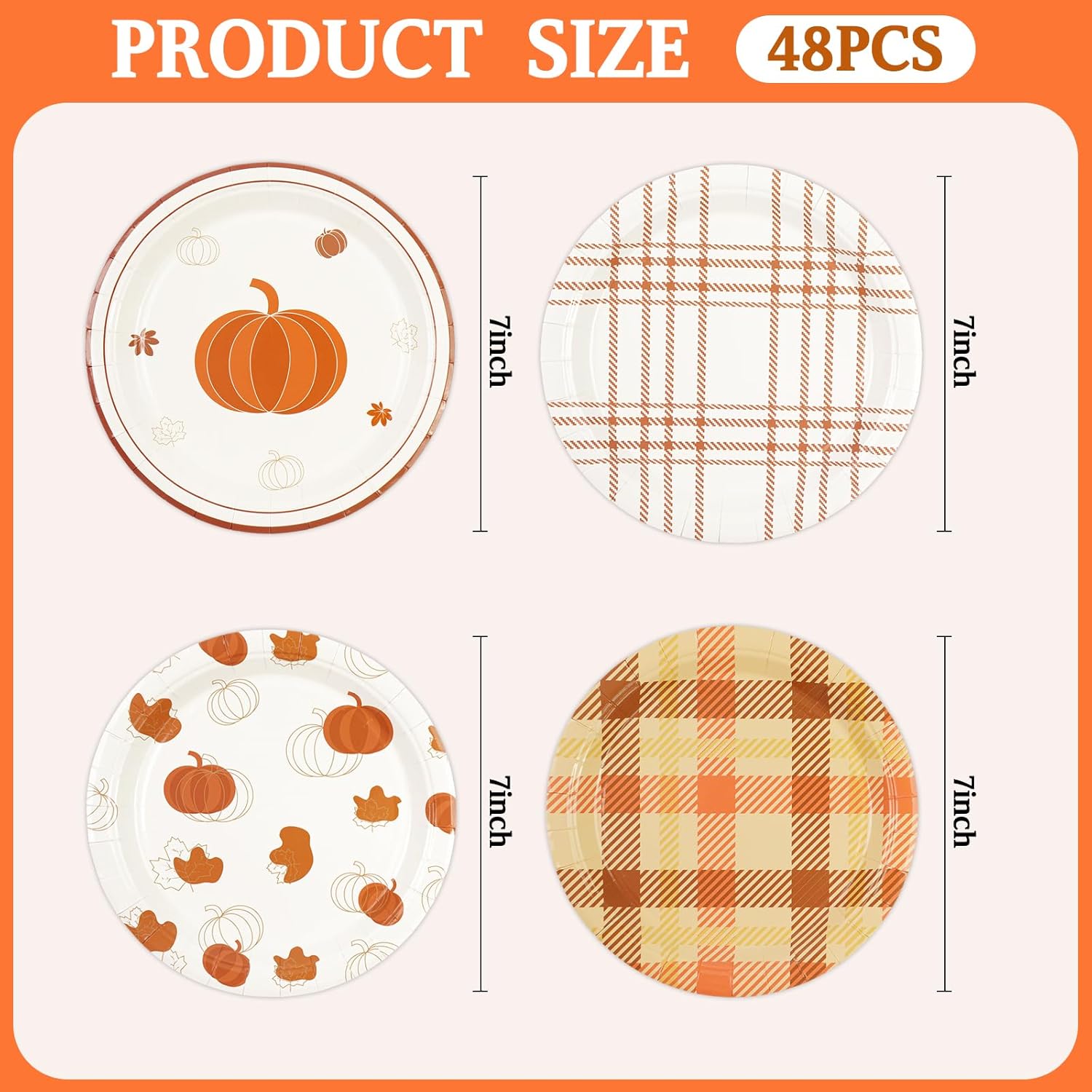 - Packaging Details: You will receive 48 pcs of 7inch fall pumpkin maple leaf paper plates in 4 different styles, with 12 pcs of each style. Perfect for serving salads, desserts, cakes, and more. Ideal for your party needs, these are the perfect choice for fall party tableware.