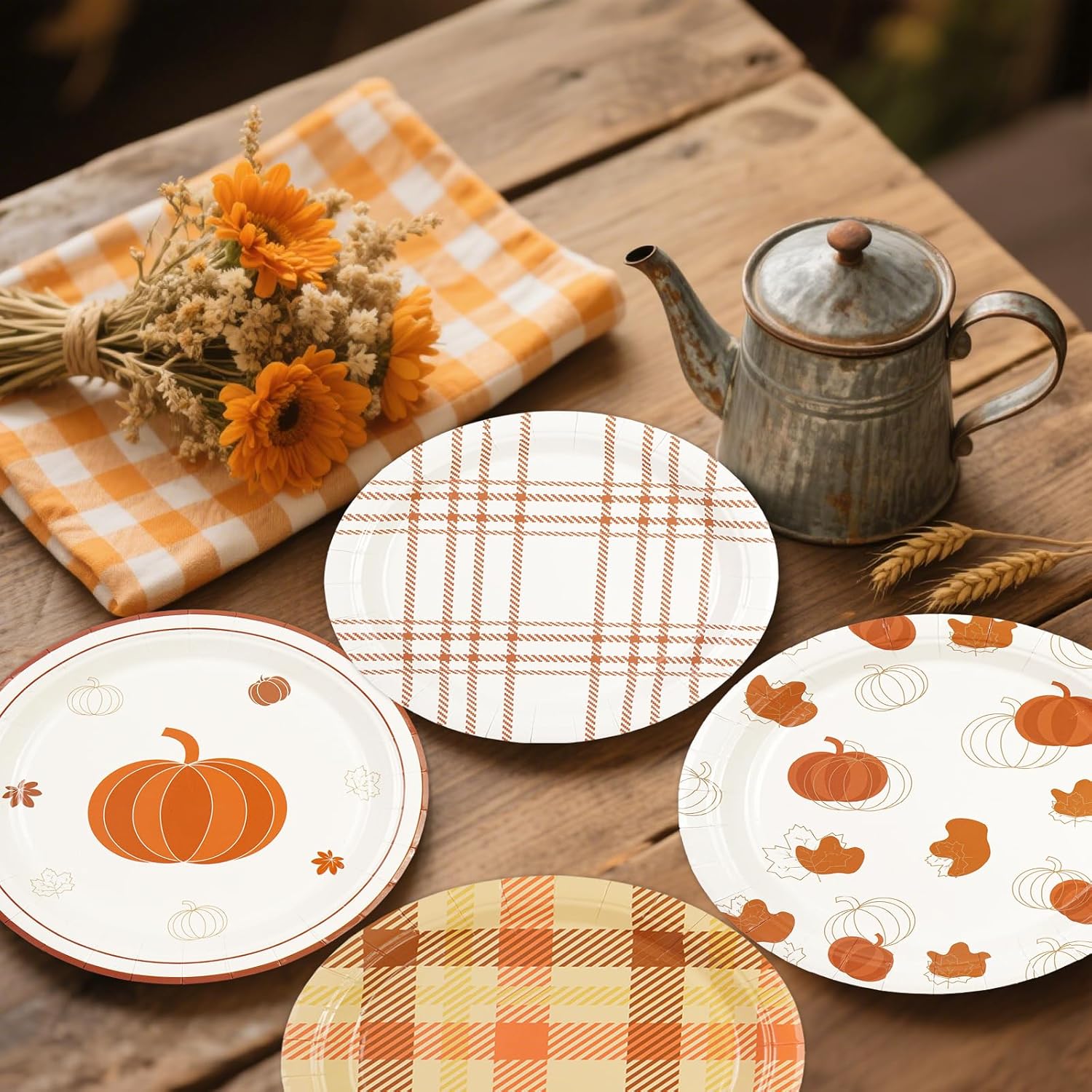 - Fall Designs: Two of our paper plates feature fall elements such as pumpkins and maple leaves, while the other two are orange and brown gingham plates. Add a rich fall atmosphere to your party.