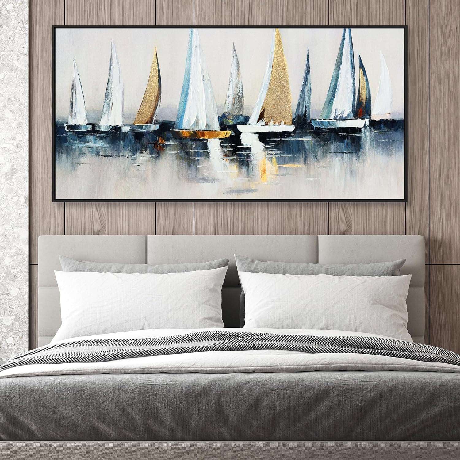 Abstract Wall Art Blue and White Sailboat Wall Paintings Framed Artwork for Living Room Bedroom Bathroom Office Home Decor Can Be Hung Directly 29"x 58"