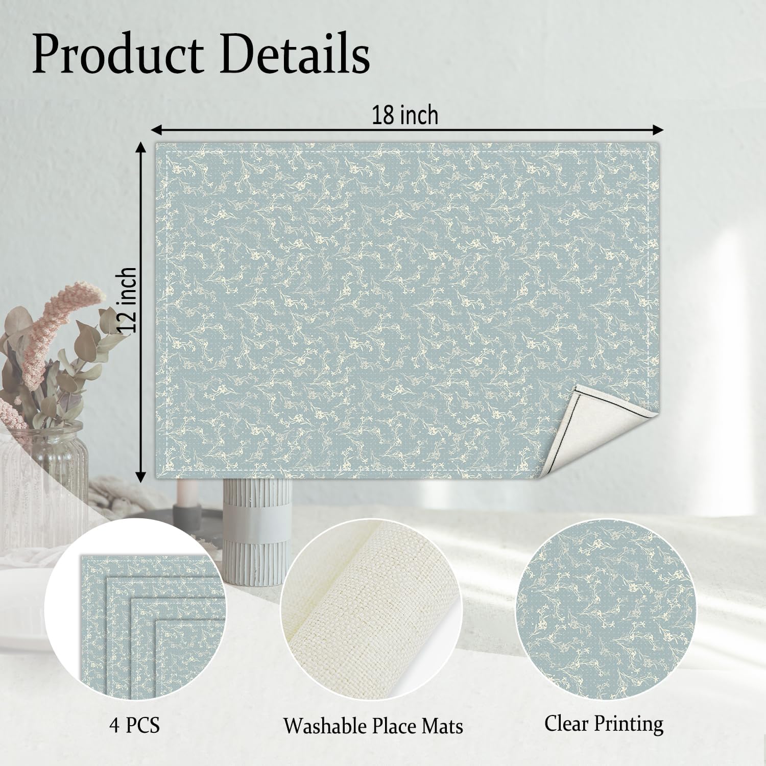 Blue Placemats Set of 4, Flower Table Mat for Home Kitchen, Restaurants, Outdoor Linen Washable Place Mats 12x18 inch Party Event Dining Decoration-13