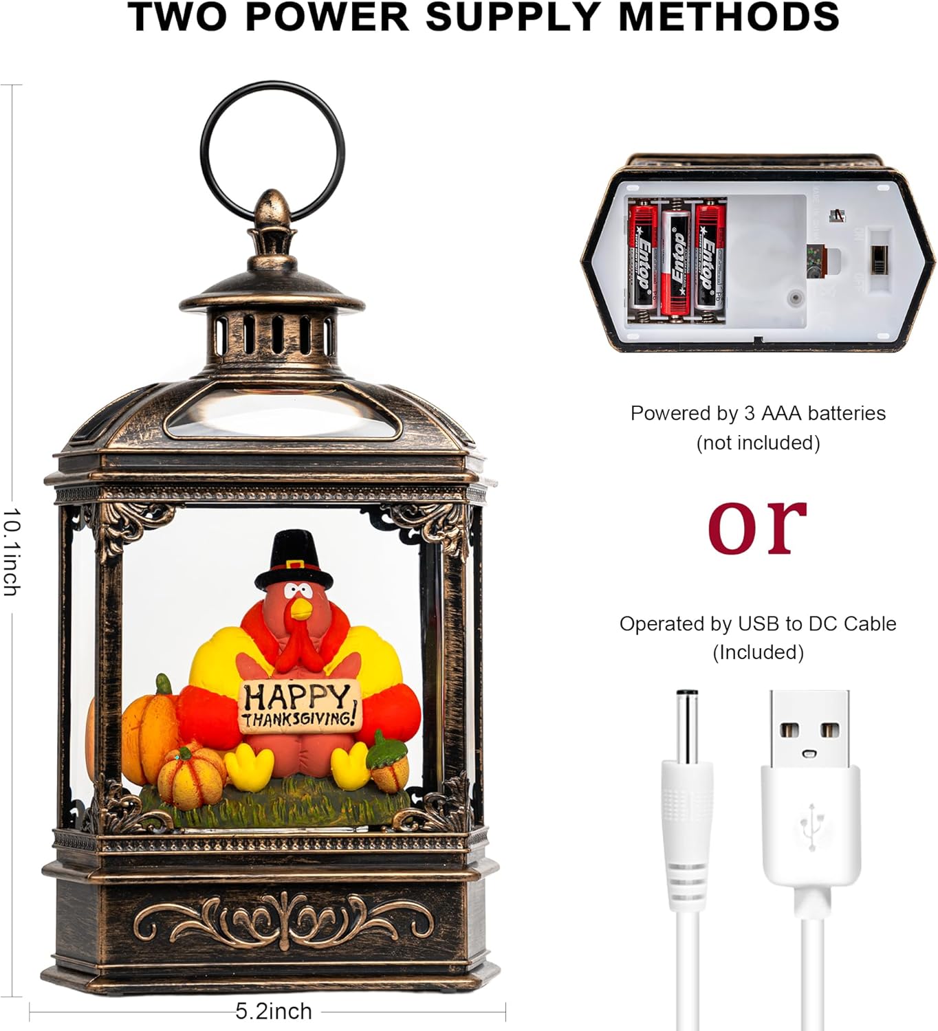 - 🦃🎃【2 Mode Power Supply】Powered by USB to DC cable (include), the snow globe lantern can be operated without batteries, which can save you a lot on batteries. & Powered by 3 AA batteries (not included), you can place it at any place that you want to add warm ambiance.