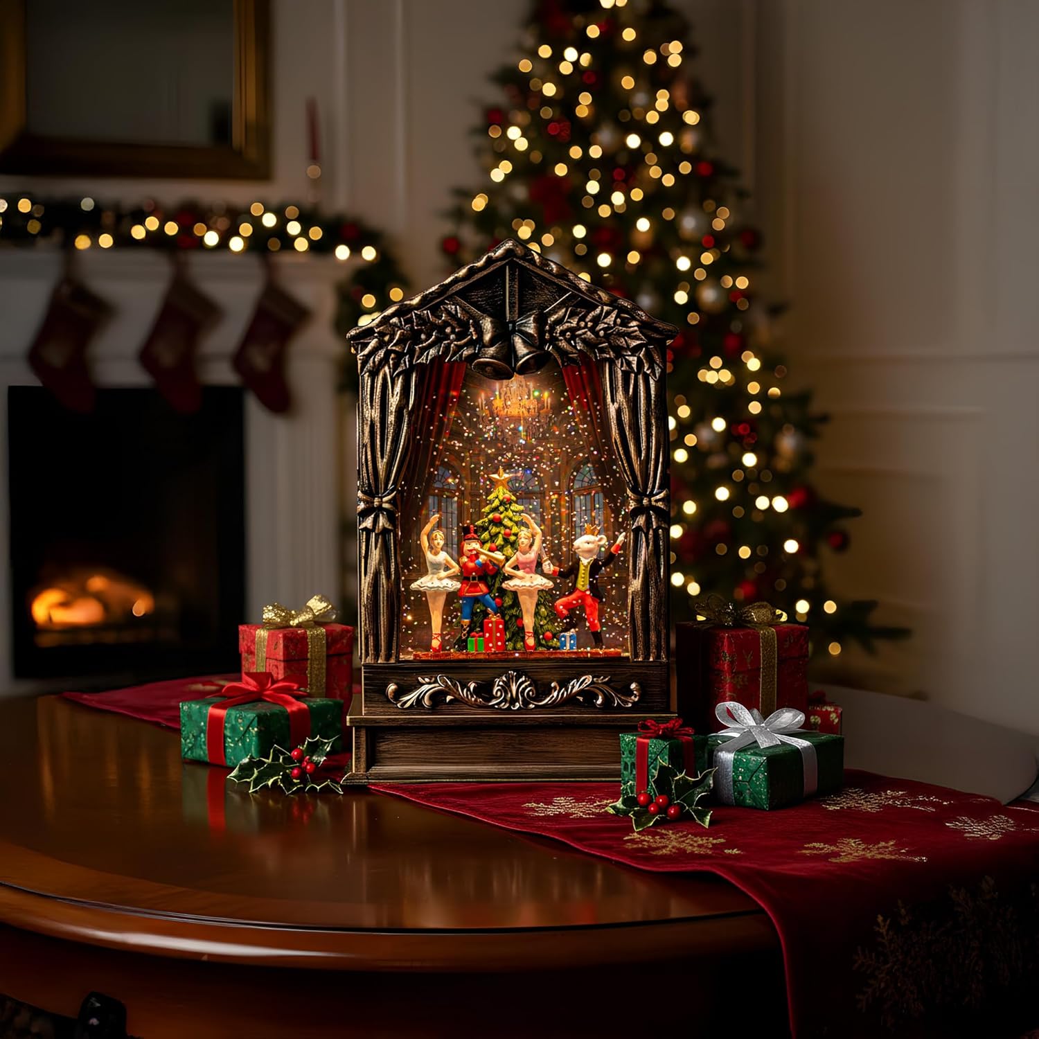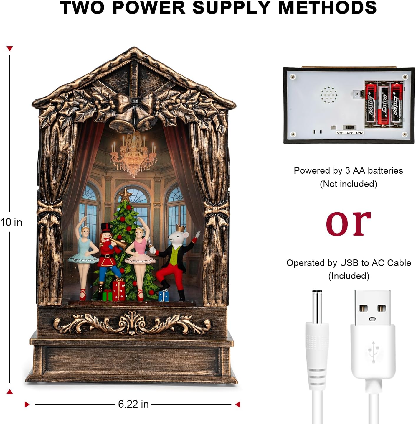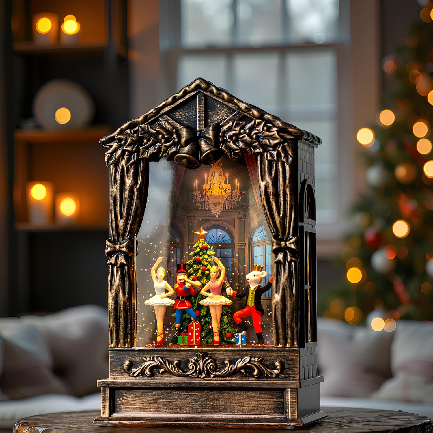 - 🎊🎄【Snow Globe Lantern】Inside our Theatre water lantern, the Nutcracker, Clara and King Rat, with a decorated Christmas tree and presents surrounded by swirling glitter. When turned on a warm LED shines down on the figurine and swirling glitter to gives our Christmas globe a whimsical look for the Christmas Holiday season.