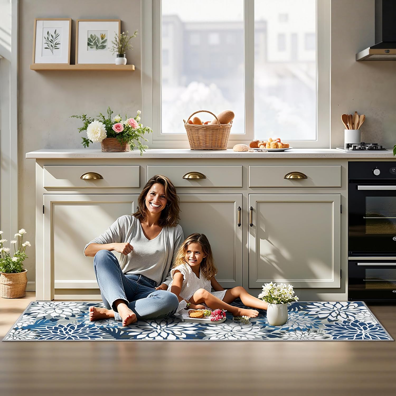 Area Rug 2x6 Blue White Washable Entry Rug Multicolored Tropical Botanical Modern Floral Indoor Kitchen Door Mat Entrance Carpet Non Slip for Bedroom Living Room, Porch