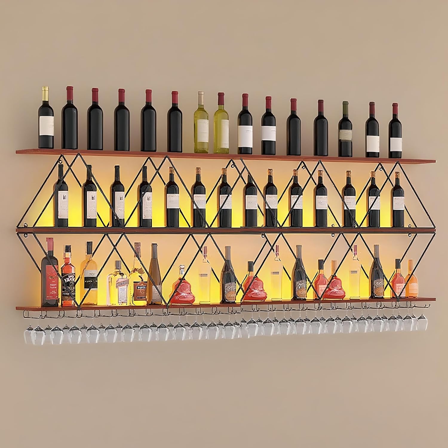 - Multi-function: Well-designed wine glass rack for wine glasses and free placement of wine. This wall-mounted wine rack can not only store wine bottles, but also other items to make your space more sophisticated.