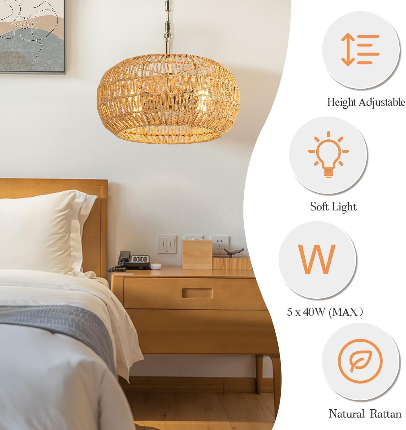 - 【Multi-Space Coastal Farmhouse Appeal】Perfect as a dining room chandelier,bedroom pendant light,or foyer fixture.The rattan light fixture complements coastal,modern farmhouse,and boho decors—ideal for adding texture above dining tables,kitchen islands,or entryway spaces.