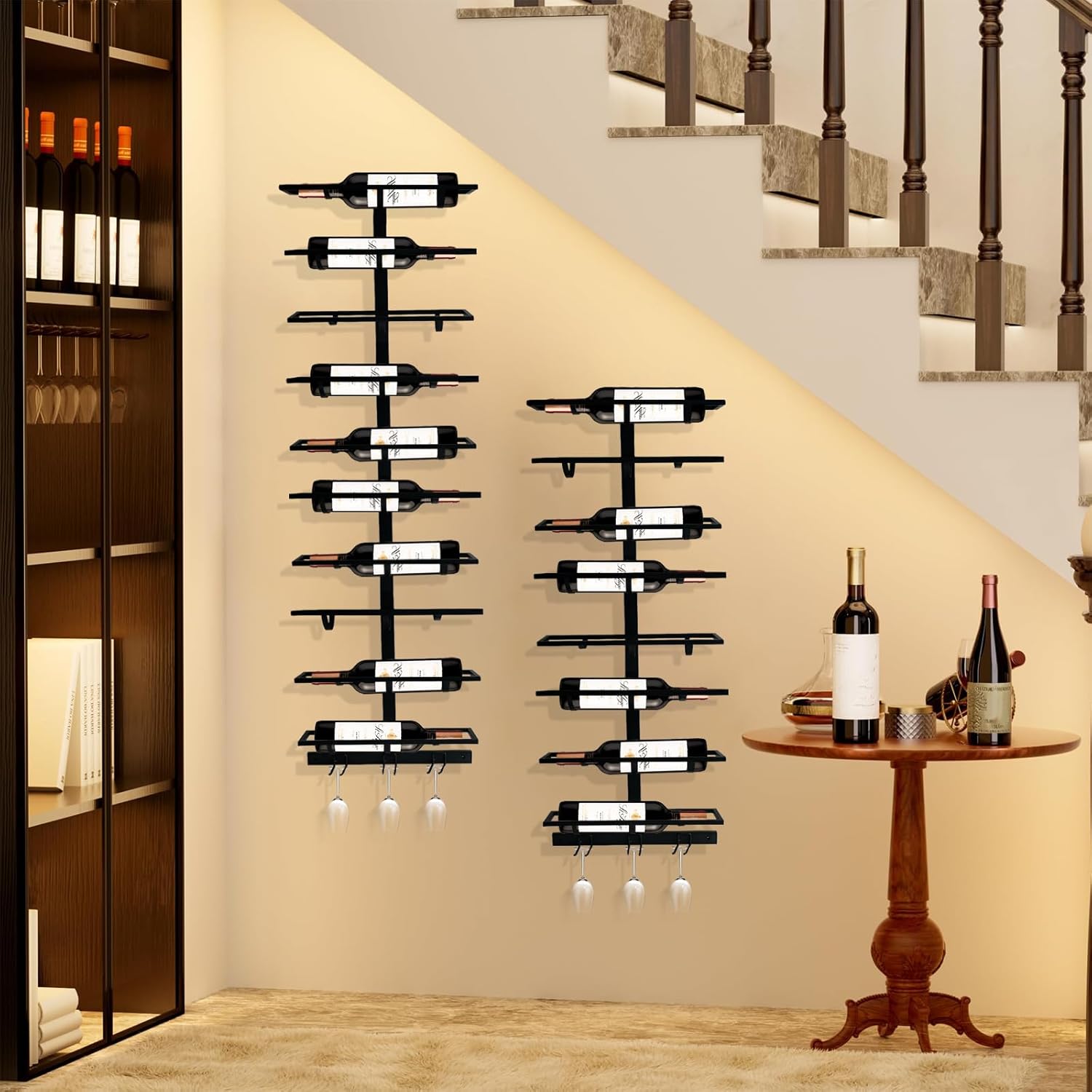 - Prevents Bottles from Falling: The wine glass rack wall mounted comes with a bottom bracket that is 0.5in/1.3cm wide, and each tier of wine shelf is supported by three bottom brackets to ensure that large and small bottles can be placed safely and attractively