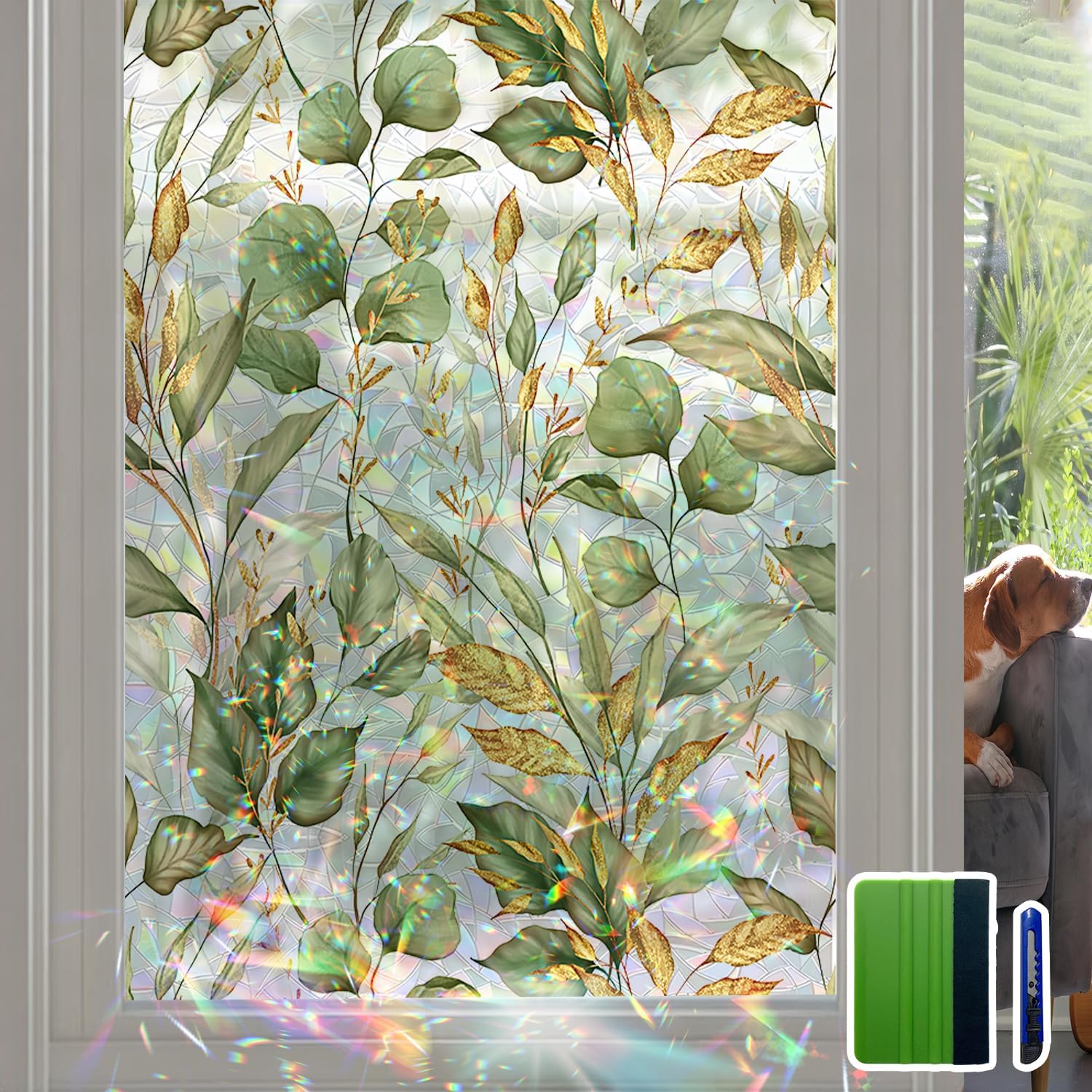 Rainbow Window Privacy Film with Tools, 3D Stained Glass Window Film, Spring & Autumn Leaves, 16.93" x 78.74"(43X200CM)
