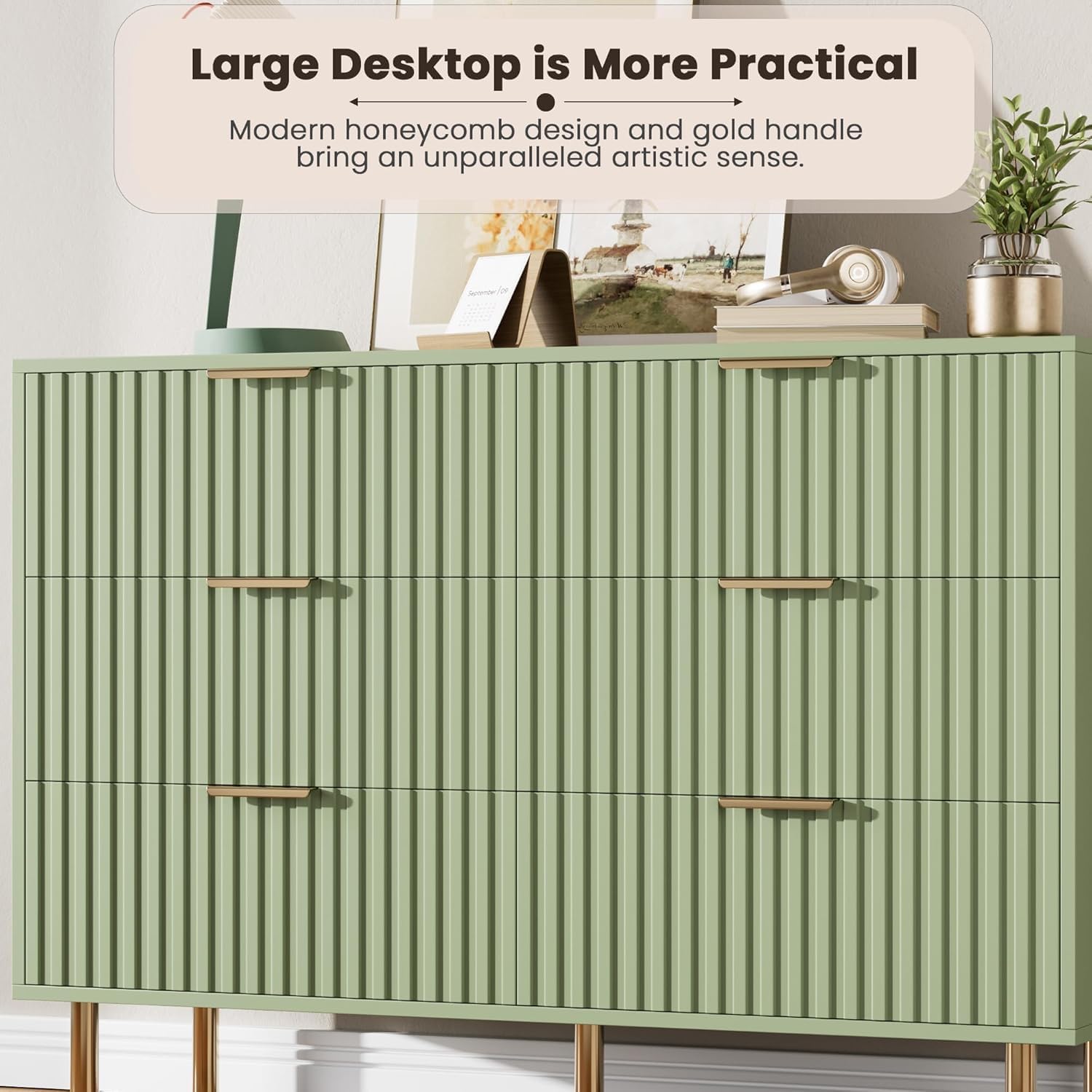 Green 6 Drawer Dresser for Bedroom, Fluted 47.2" Wide Modern Chest of Drawers with Deep Drawers, Long Large Double Dresser TV Stand for Living Room, Hallway, Kids Room