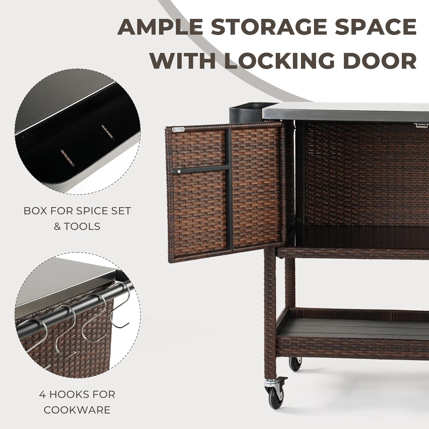 - Large Storage Space: The tabletop of the patio bar cart has a capacity of up to 150lbs. The large storage cabinet equipped with 2 doors can protect food and tableware from sun, dust, stains and rain. The side handle has 4 hooks for hanging barbecue grills, cutting boards, etc. Each hook can bear 19lbs, allowing for the suspension of a propane tank, and other tools