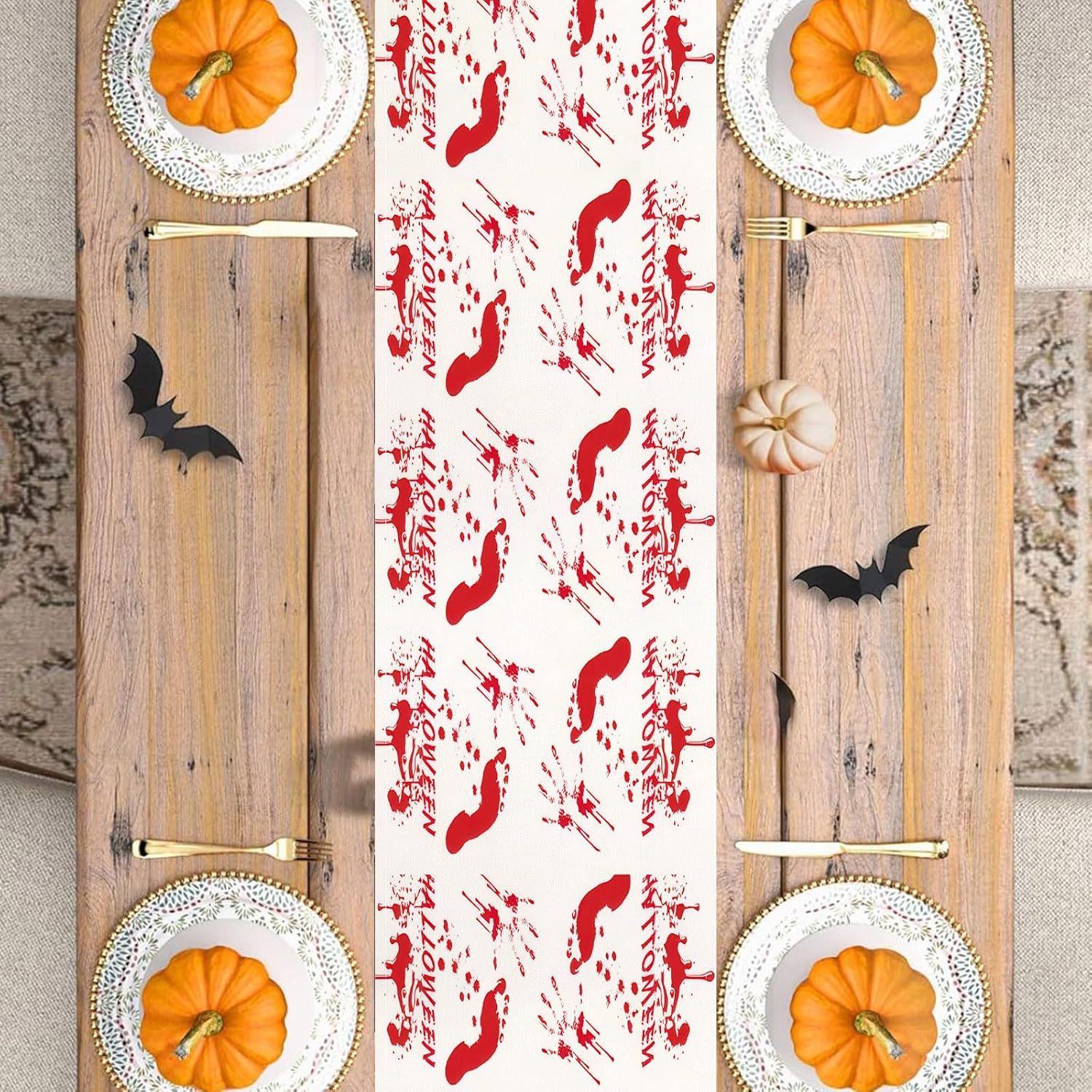 - Package Content: Includes 1 Halloween table runner (13x36 inches) with red bloodstains and footprints printed on it, these classic Halloween elements instantly turn your dining table into the focus of the holiday