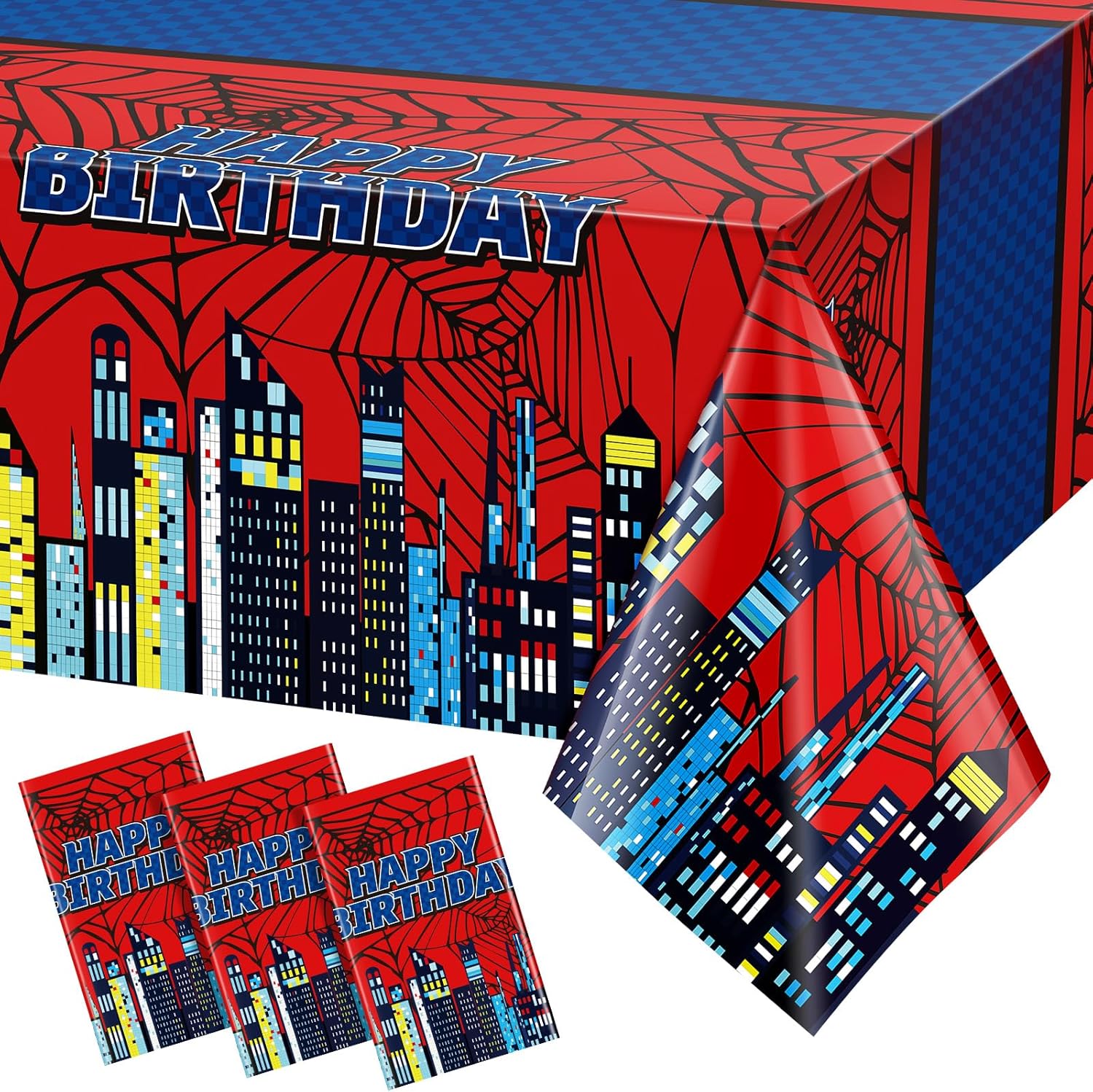 - Spider Party Design: Featuring a vibrant red and blue color scheme with spider webs and a bold city skyline, these birthday tablecloths add instant excitement to spider themed birthday parties or comic inspired events