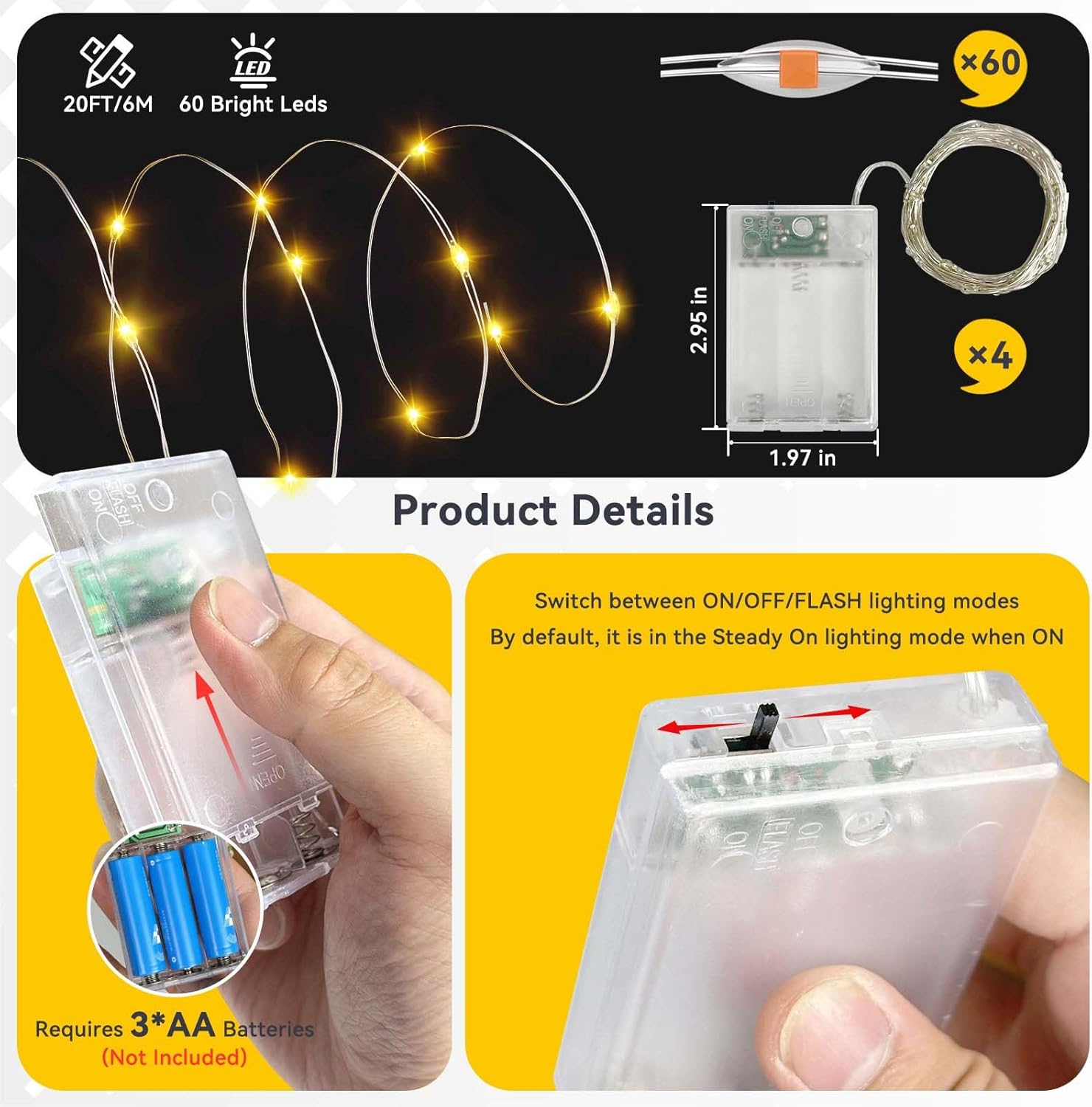 - Ultra-Bright Fairy Lights Battery Operated: Each pack includes 4 separate copper wire fairy lights, each featuring 60 brilliant LED bulbs, for a total length of 20FT. Effortlessly illuminate and decorate multiple areas like bedrooms, bookshelves, dining table centers, balconies, patios, and porches—instantly adding a warm, cozy glow to your holiday parties or daily home ambiance.