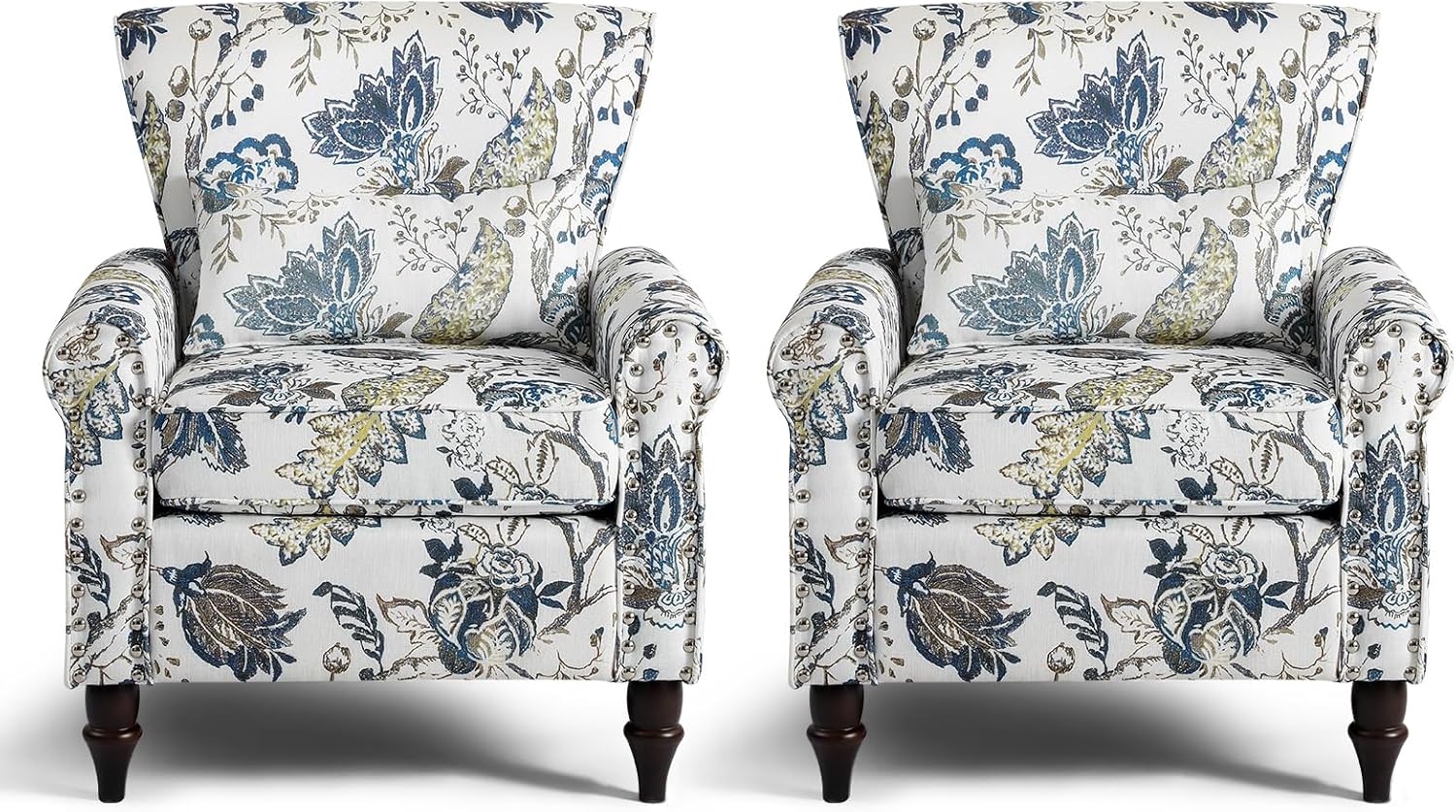 Wingback Accent Chair with Removable Pillow, High Back Floral Armchair with Solid Wood Legs & Nailhead Trim, Comfy Upholstered Reading Single Sofa Chair for Bedroom (2, Blue Floral Pattern)