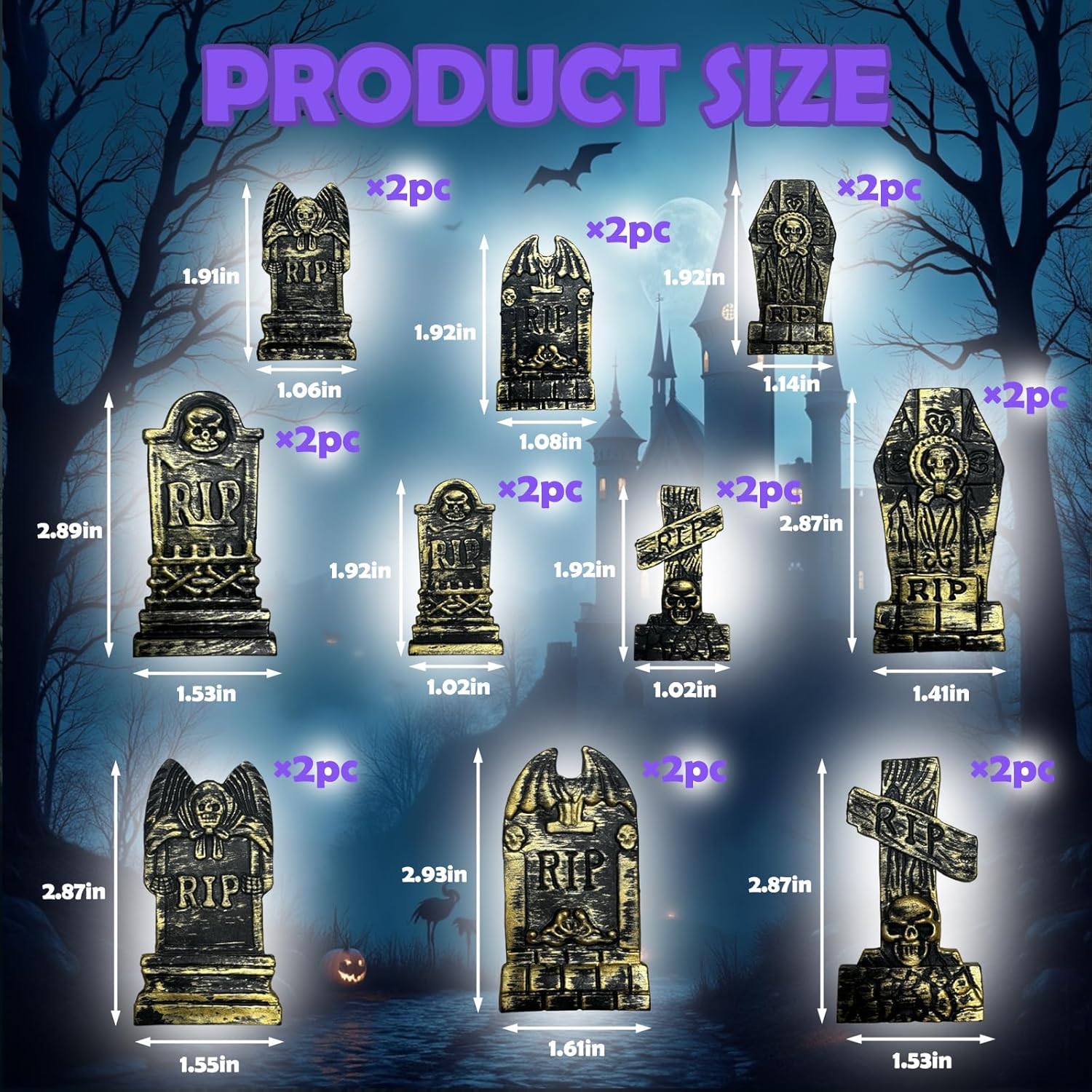 - Halloween Tombstones Set: A total of 20 Mini Halloween Tombstones Figurine. Allow you to decorate your home, event venue, or Halloween landscape with bizarre and scary themes.