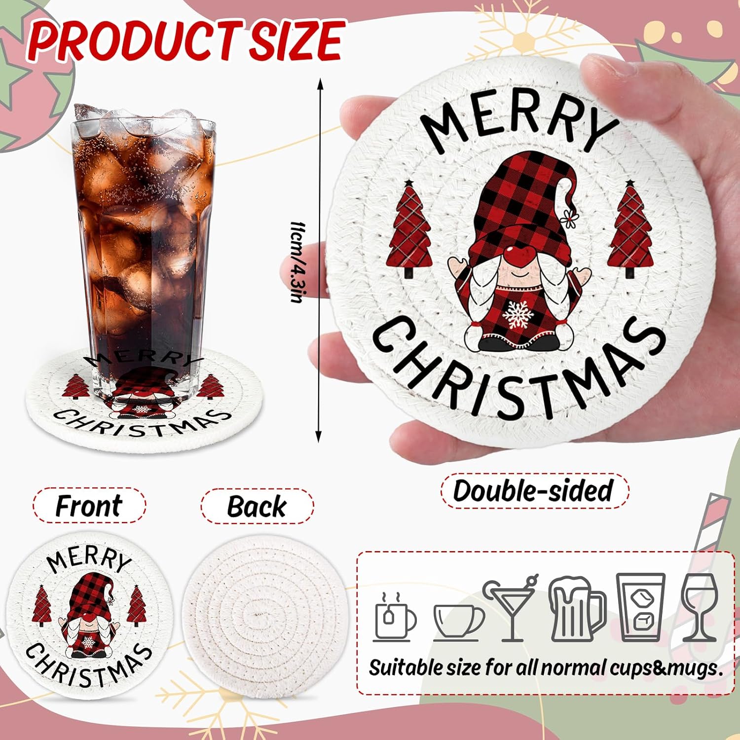 Whaline Merry Christmas Cotton Coasters Xmas Plaid Tree Gnome Handmade Braided Drink Coasters Absorbent Cup Mats for Christmas Holiday Party Home Table Decor, Set of 4