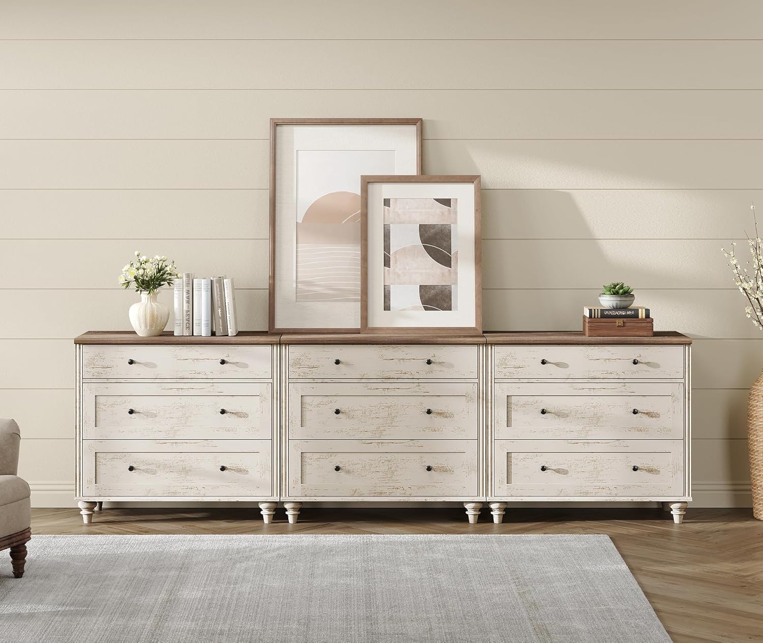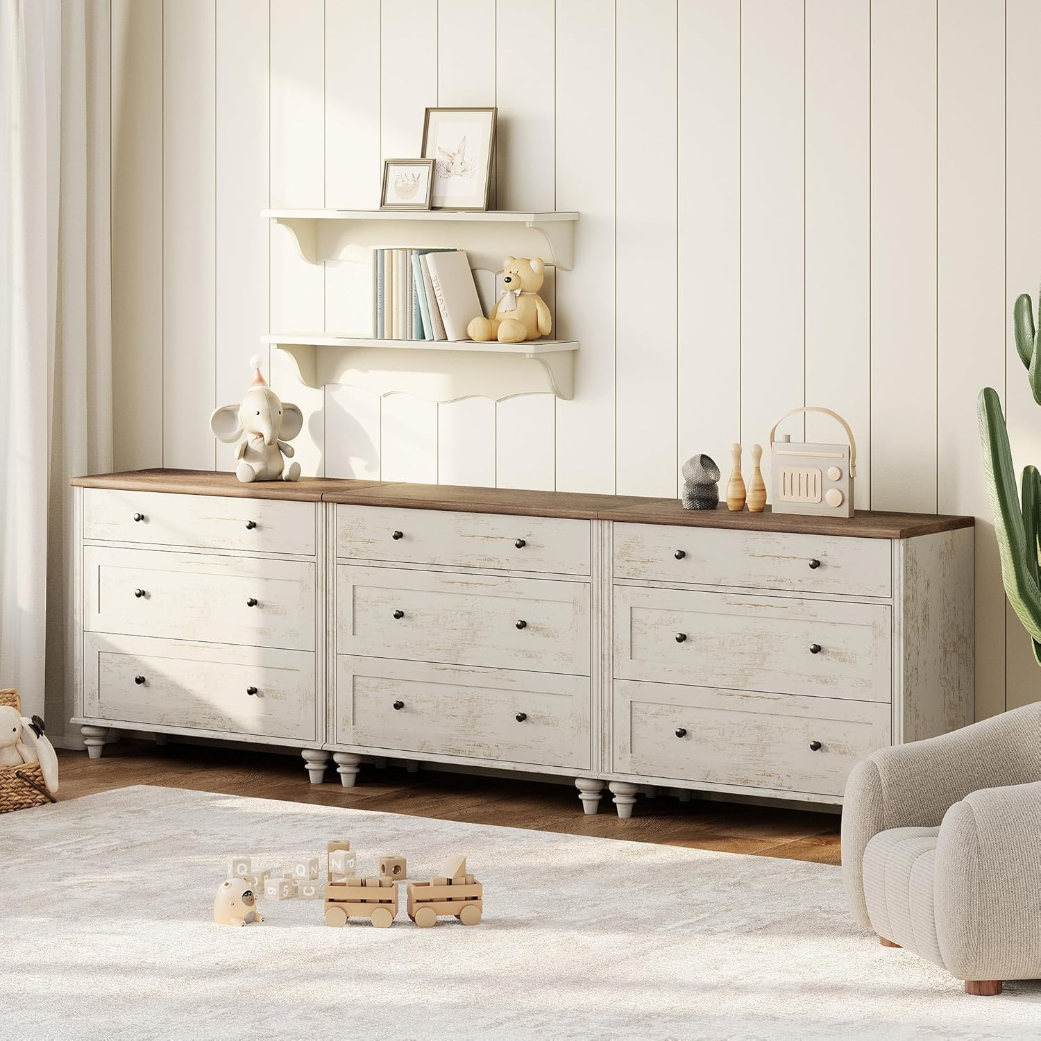 - 【3-in-1 Multipurpose Dresser】The large dresser can be used together as 9 drawer dresser or tv stand for 100 inch tv, or used separately as 3-drawer dressers.With distresser suface is very classic and elegant which blends in easily with any decor. It is ideal as a baby dresser, kids dresser and console table, etc.