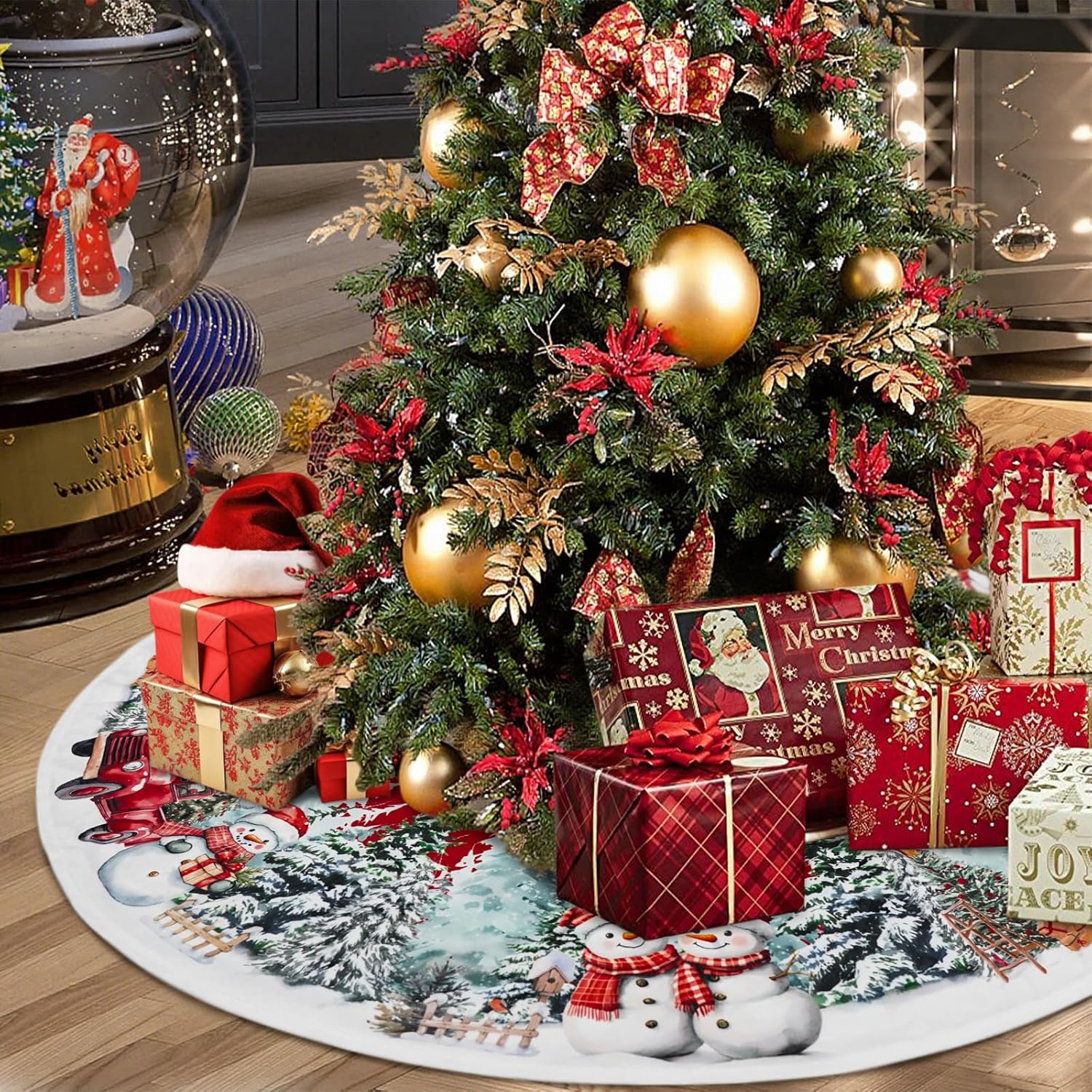 Christmas Tree Skirt 36 Inch, Red Snowman Trucker Xmas Tree Skirts, Winter Christmas Trees Mat for Home Party Holiday Indoor Outdoor Decorations