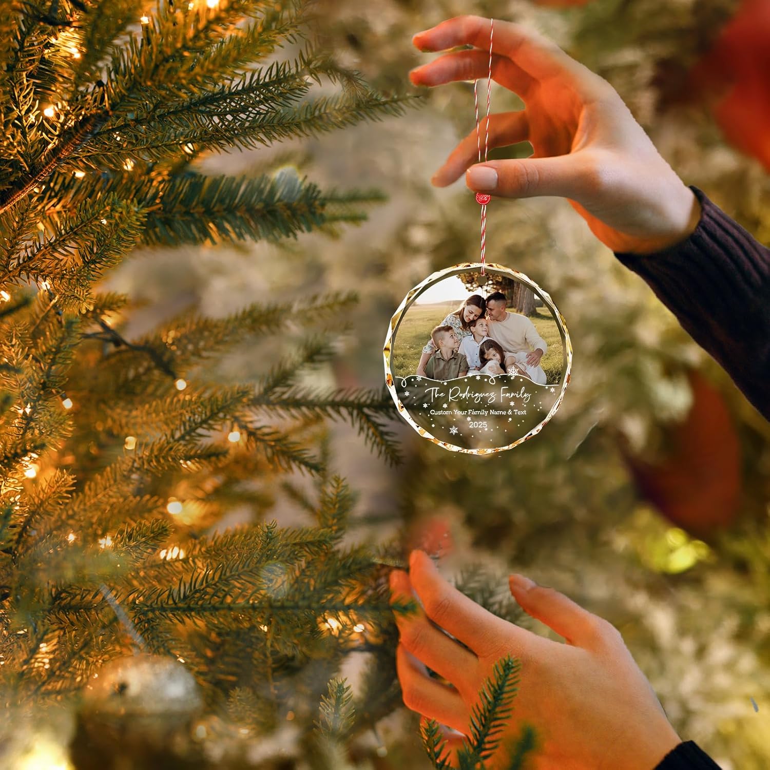 - 💎 Custom Crystal Family Ornament – Crafted from premium clear crystal, this ornament allows you to upload a family photo and add names or year. A beautiful way to celebrate your family’s holiday memories
