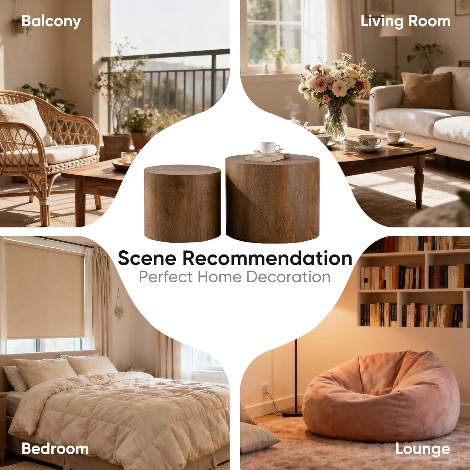 Nesting Round Coffee Table Set of 2, Small Circle Accent End Table for Small Spaces, Morden Drum Side Table, Wooden Center Table for Living Room, Fully Assembled - Light Walnut